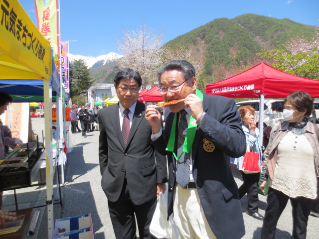 テントが並び、はな、木像、木工芸、鹿角細工、おやき、五平餅、だんご、そばなど沢山出店していました。私は古代米の御幣餅を戴きました。美味しかったですよ。 大道芸、大正琴、演歌体操、踊りの池上社中の皆さんのパホーマンスも素晴らしかったです。 楽しかったGWも終わり、いよいよ県政活動も本番という所です。