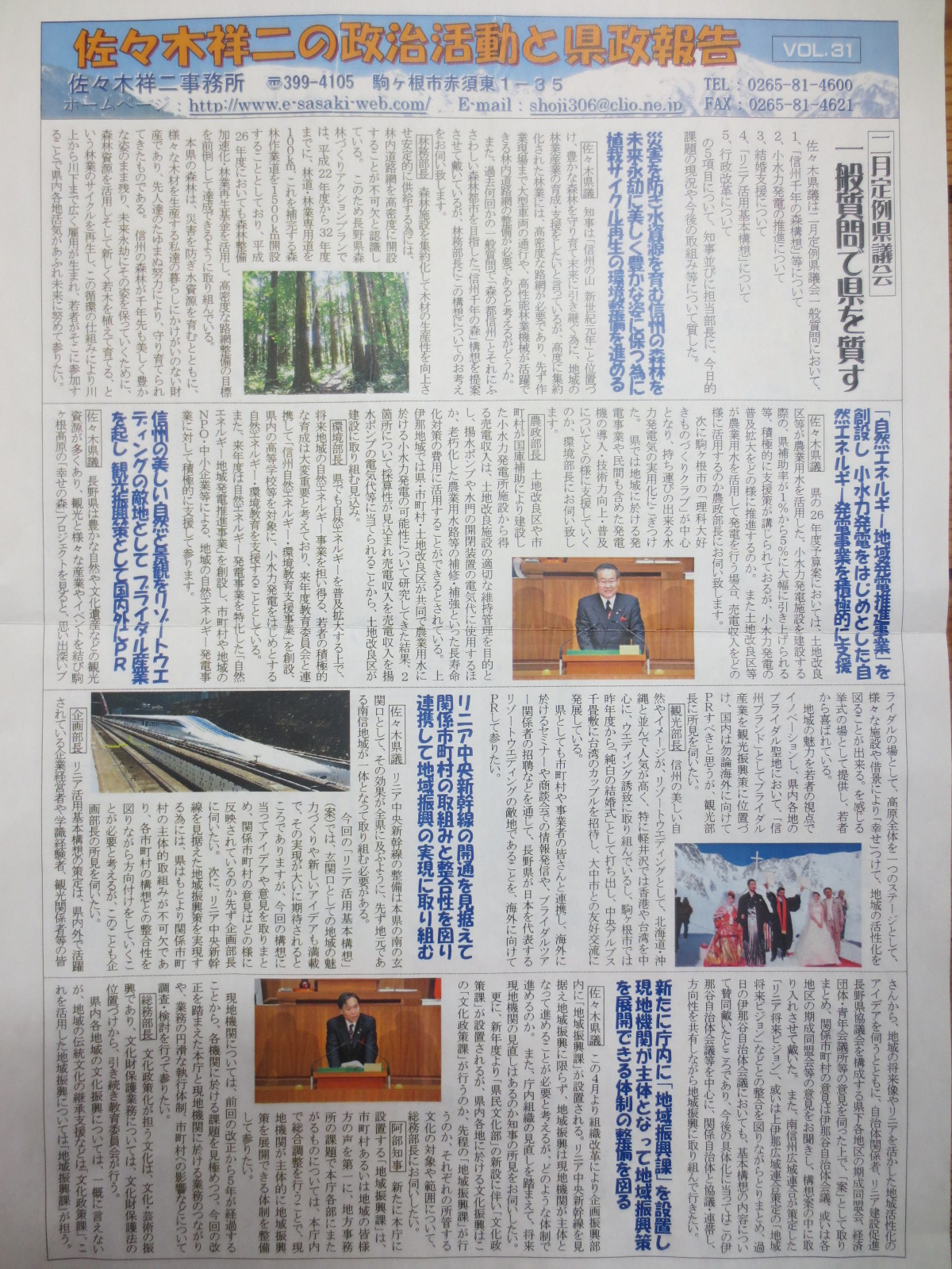 私は、公約の一つに、毎日の「祥ちゃんブログ」更新、月一回の県政報告会開催、議会毎の政治活動と県政報告書作成配布、そして年一回の女性対象の県政報告会と全体の県政報告会を開催することを約束しています。そのチラシが出来ました。 2月県議会の一般質問の様子と県を質した内容です。 信州千年の森構想について、自然エネルギーの活用について、ブライダル産業を興し観光振興と国内外のPRを、リニア中央新幹線を見据えた地域振興策、そして行政改革など県を質しました。 次に、リニア活用基本構想(案)について、リニア推進本部長は?地域振興推進本部は?そして愛知県にある東三河県庁を例にした本部を南信地域に設置し南信地域の地域振興に取り組んで戴きたいと要望いたしました。 そんなチラシが出来ました、今後の各地域の県政報告会の資料に使います、参考にしたい方はメールにて希望してください、メールもしくは郵送で送らせて戴きます。