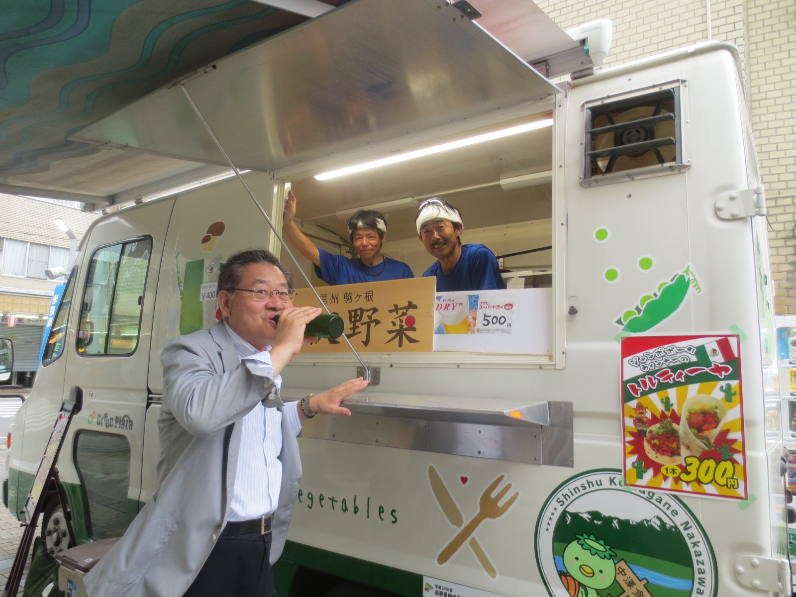 中でも、「中沢食堂」車が注目を浴びていました。 これは長野県元気づくり支援金を活用し、食育を中心に地域の野菜などを使って料理調理をして、保育園など巡回して啓蒙していく車です。 もう一つ、「すずらんソフト」も人気を集めていました、濃くて美味しいソフトクリームでした。 社長の大川さんとツーショットでした。 それぞれ縁日に協力してくださり賑わいを創出してくれています。感謝です。