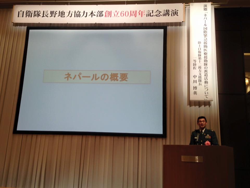 6日11時より、中川博英1等陸佐12方面隊長の記念講演がありネパール国国際医療支援のお話をお聞き致しました。