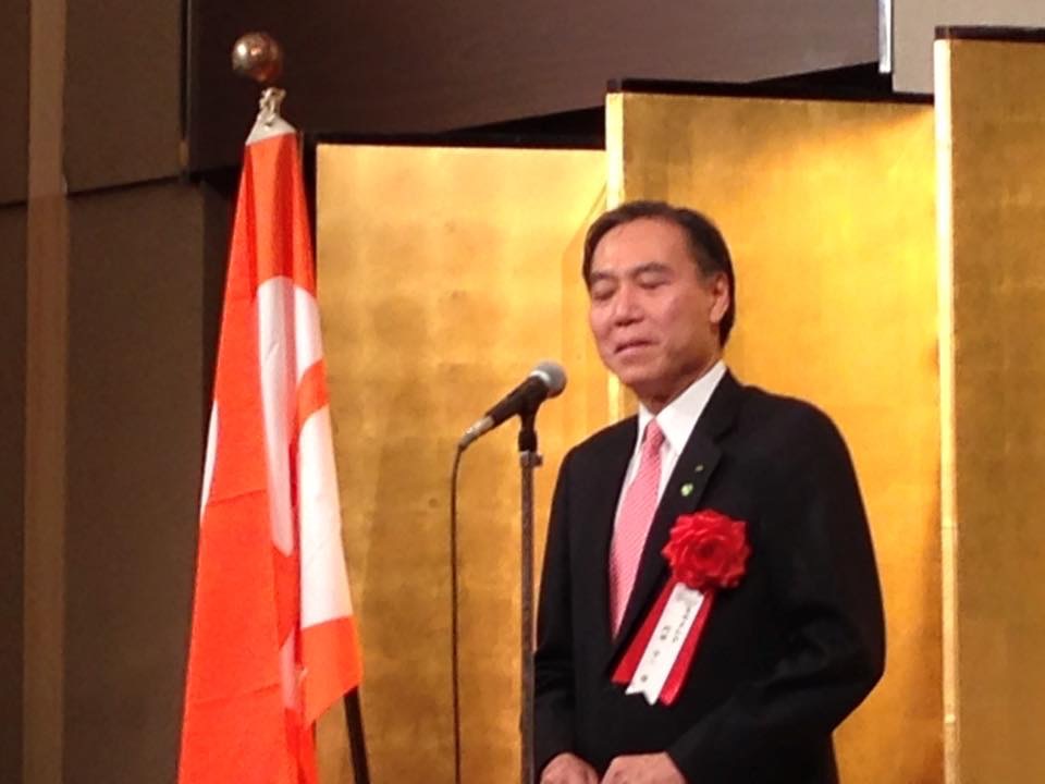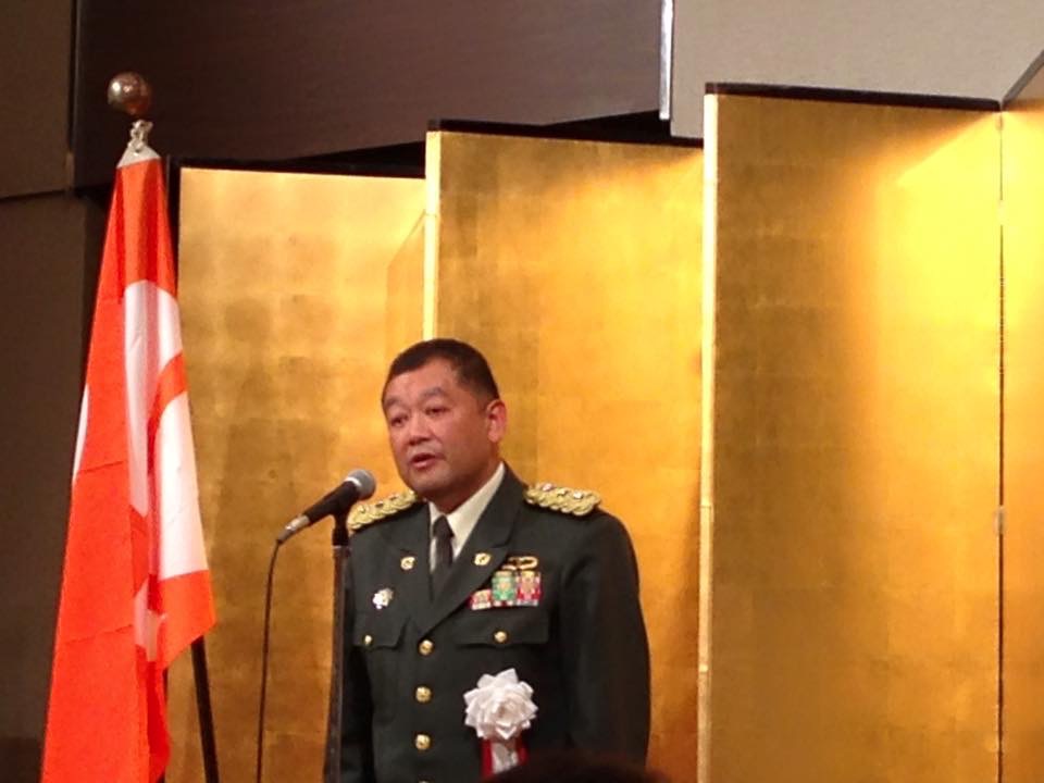 その後の祝賀会では阿部知事が御嶽山災害など後藤本部長に感謝申し上げ日頃のご挨拶を申し上げました。 西澤議長からも感謝申し上げ、乾杯条例可決の話をして、早速地酒で乾杯を致しました。よ〜。 後藤1等陸佐第31代自衛隊長野地方協力本部長が五郎丸の格好をして3ツのお願いをして祝賀会の開会式を終了致しました。 私も、長野県議会安全保障議員連盟の副会長の立場で出席させて戴きました。 次の70周年に向け頑張って下さい。ご期待申し上げます。