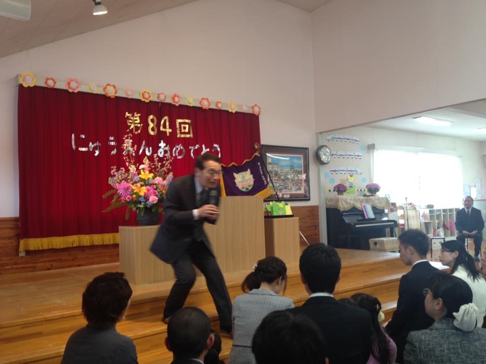 小原理事長の挨拶で始まりました。 私も娘二人と孫もお世話様になっています。 来賓祝辞でお祝いを申し上げました。 式典が終了後、歓迎の劇手遊びなどで雰囲気を醸し出していました。
