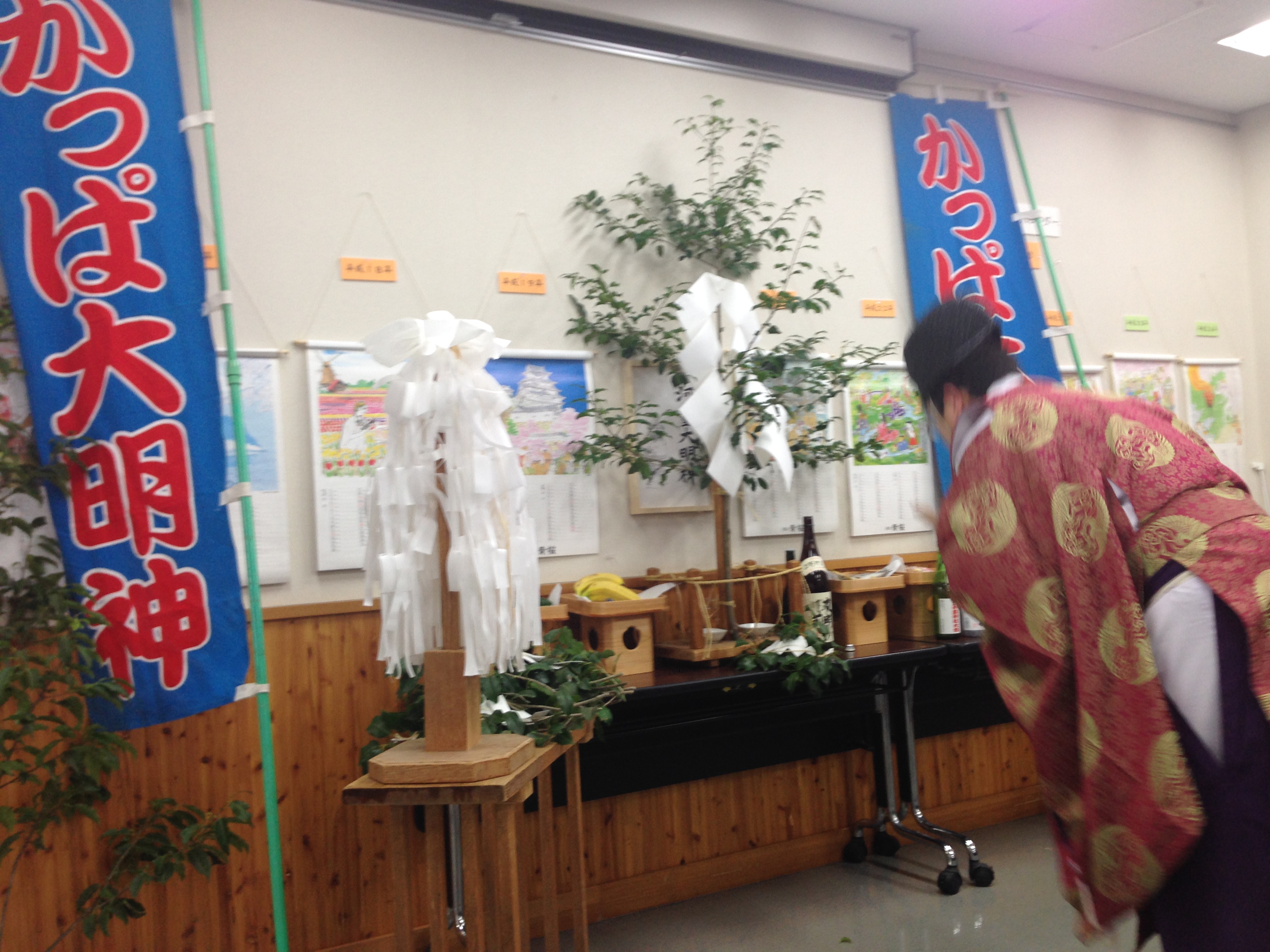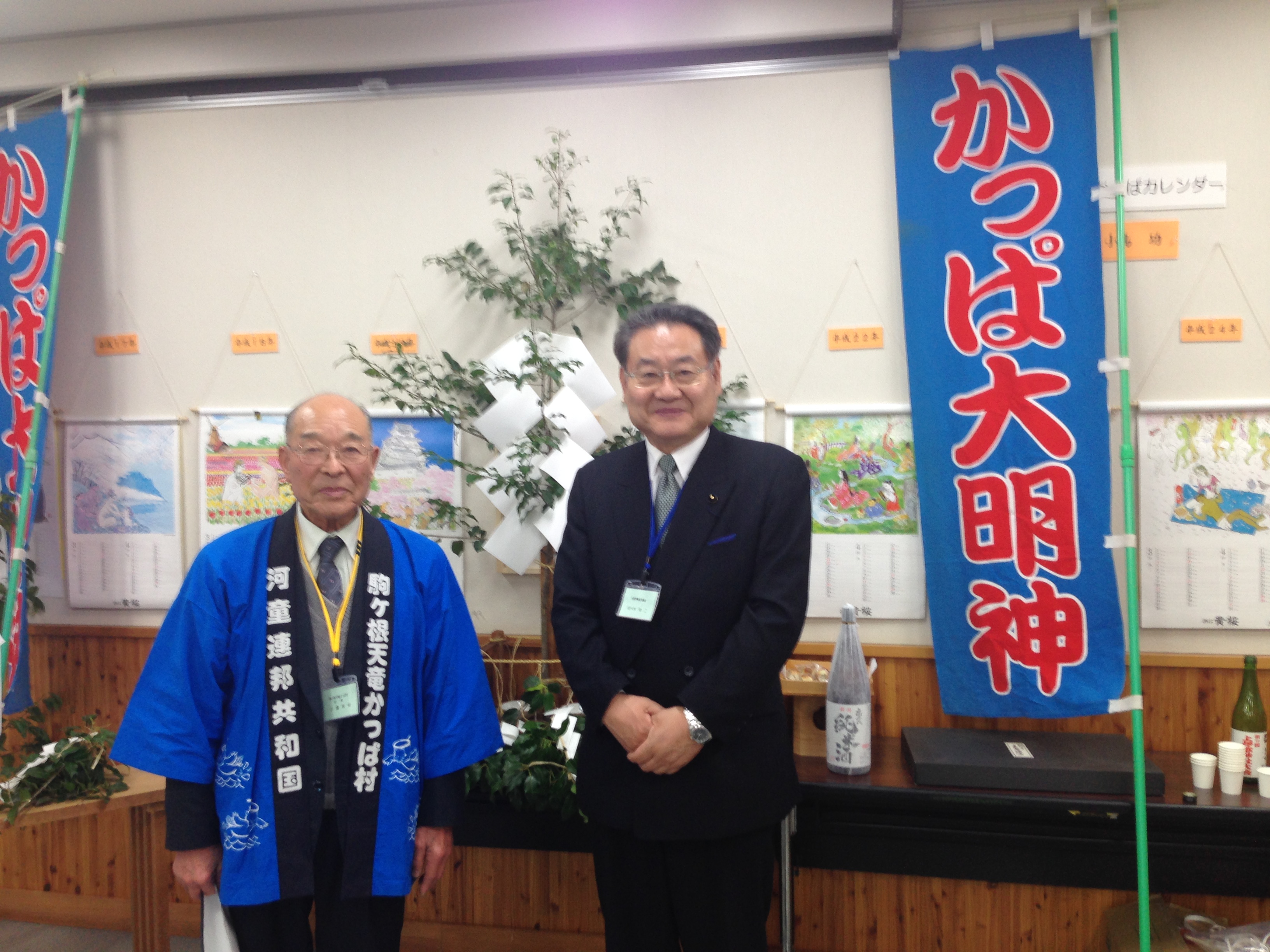 天候の都合によりまして駒ヶ根かっぱ館にて安全祈願祭を取り行いました。 小島村長さんと写真を撮りました。 5時よりグリーンホテルにて祝賀会がありました。宇田川かっぱ連邦共和国大統領も参加して盛大に開催されました。