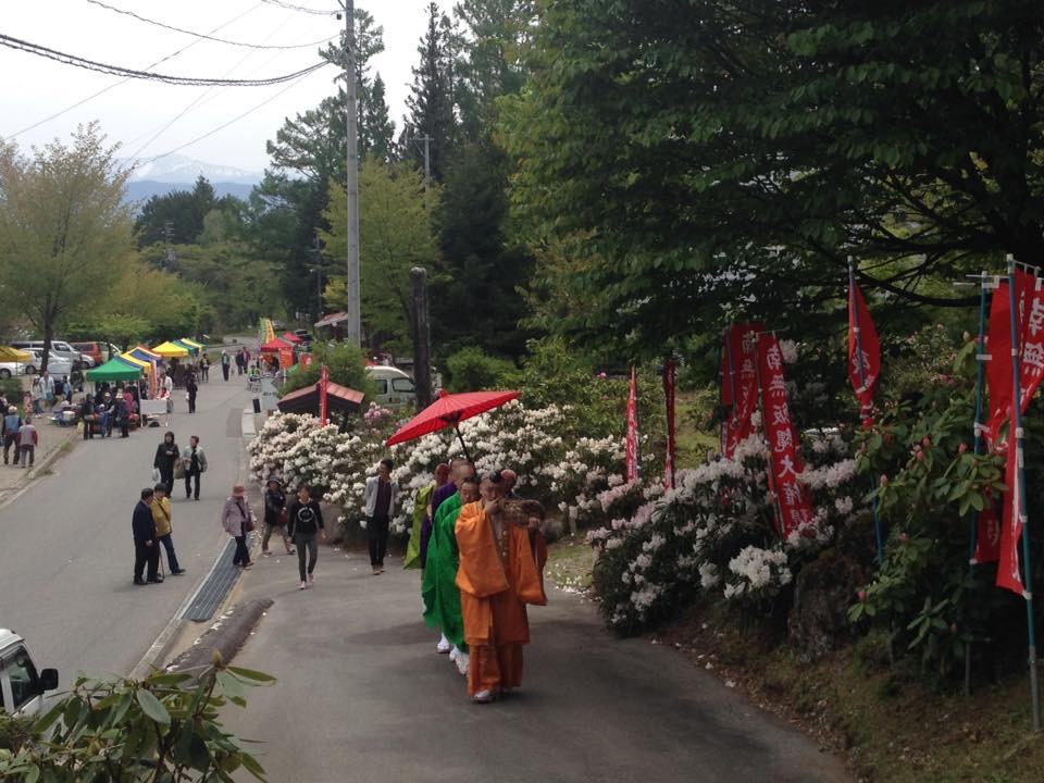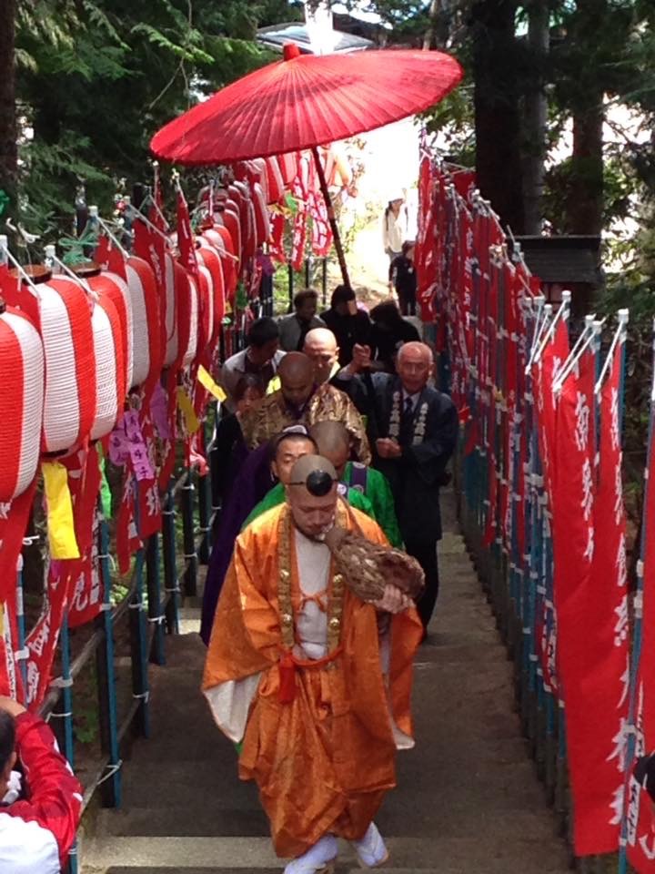 山伏先導にて本堂に向かいました。 熊本震災の終息を願い、被災者の方々のお見舞いそして日本国の弥栄と長野県の平安、信徒檀徒の安全安心と安寧を願いお護摩が焚かレました。 その後、お数珠頂戴があり全員にお数珠頂戴されました。