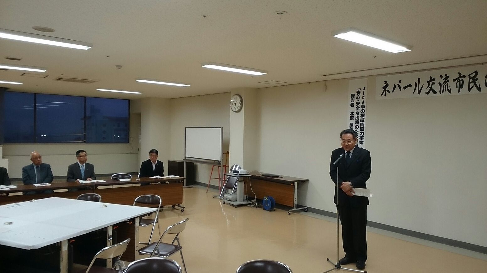 小松原会長より挨拶があり会は進行して行きました。 私も来賓として又、会の顧問として挨拶させて戴きました。 総会も原案可決でした。その後草の根交流中間報告会が北原プロジェクトマネージャーから報告があり勉強させて戴きました。