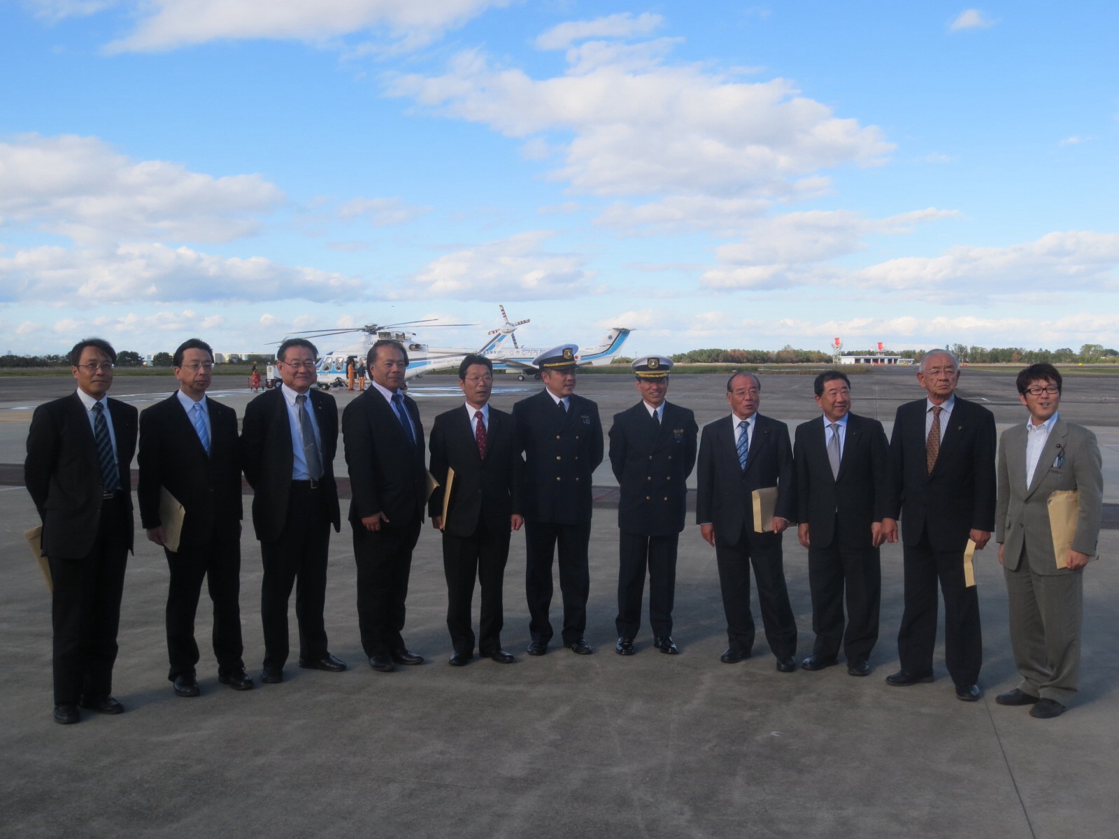 グランドでは訓練が行われており緊張した面持ちで進行していました。 その後、震災当時の状況、復興状況、又七ケ浜の現地も視察させて頂きました。 午後は、海上保安庁仙台航空基地を調査させて頂きました。震災の状況、又復興状況を視察させて頂きました。映像でも見せて戴きましたがすごい津波で声も出ないほど凄まじい状況でした。 最後復興状況を見せて戴き皆さんで集合写真を撮りました。まだまだ復興状況は進んでいませんが計画実行など勉強になりました。有難う御座いました。頑張ってください。私たちも出来る事は協力させて戴きます。