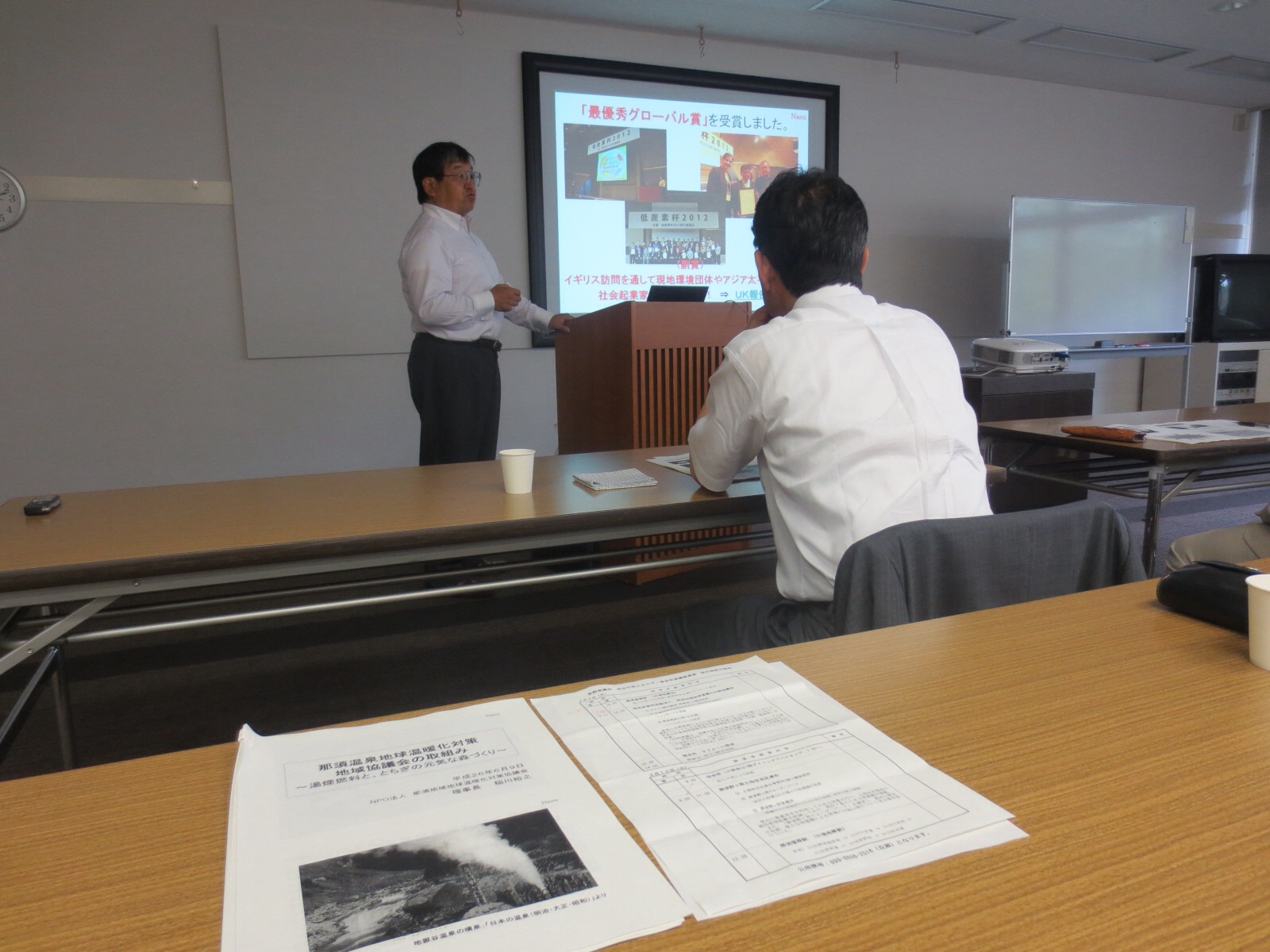 NPO那須地域地球温暖化対策協議会の稲川理事長よりお話しを聞きました。 温泉の話しからヒートポンプ、エネルギー、地球温暖化対策など、含蓄の有るお話をk拝聴させて頂きました。 その後現地調査視察をさせて頂きました。 目から鱗が落ちる話しばかりでした。長野県でも活躍中とも聞きました。乞うご期待です。