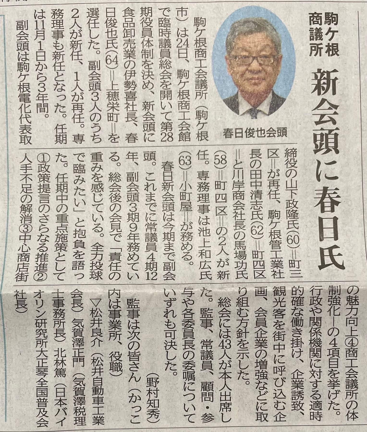 25日今日も天を敬し報恩感謝にて元気に張り切って働きます。 昨日24日、駒ヶ根商工会議所の議員総会があり,第28期役員体制が決まり,新会頭に春日俊也氏が選任されました。 私からも国県市と商工会議所と協力しながら,駒ヶ根市発展と企業誘致・中心市街地活性化及び人手不足解消や観光開発など私も汗をかいて参ります。 前会頭・役員の皆様方今後もお力をお願い申し上げます🤲 ![]() ![]() ![]() ![]() ![]()