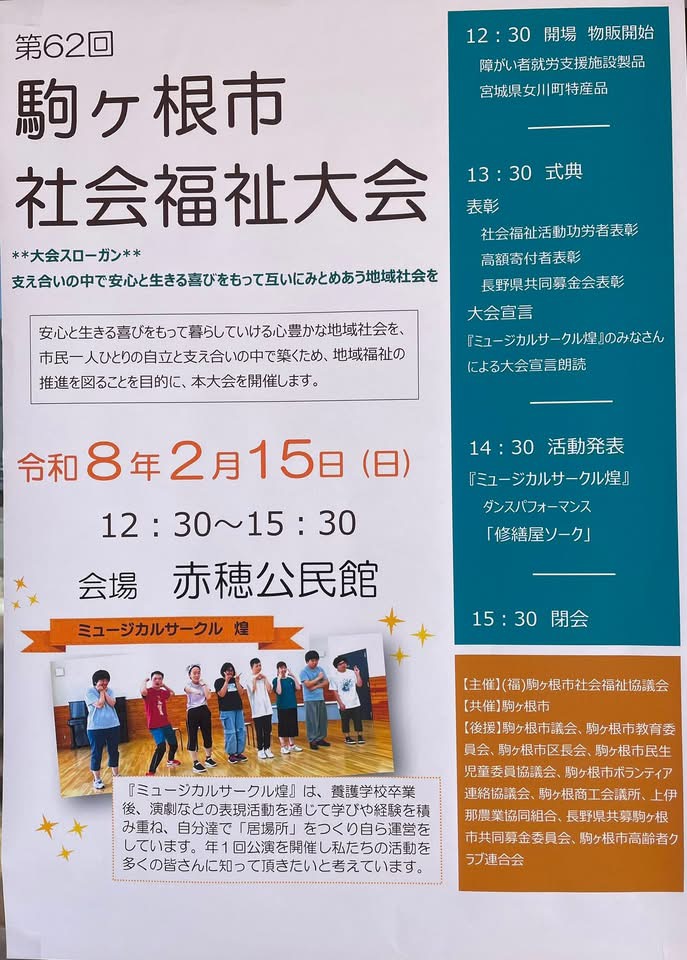 16日今日も輝く県政の灯火を頼りに,希望の光を信じて進んでいきましょう。 昨日15日は、令和七年度第62回駒ヶ根市社会福祉大会に参加させて戴きました。 長年の御労苦に対し表彰式が有りました。 大会宣言後ミュ-ジカルサークル煌(きらめき)の活動のステージ発表が有りました。 素晴らしいステージでした。よ。がんばってください。応援させて戴きます。 ![]() ![]() ![]() ![]() ![]()