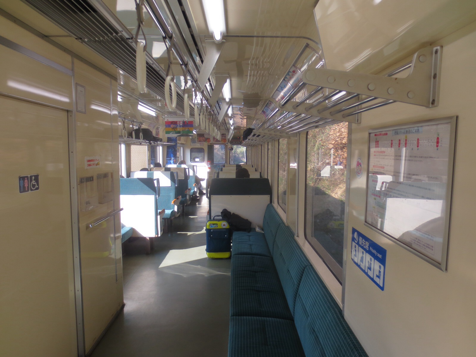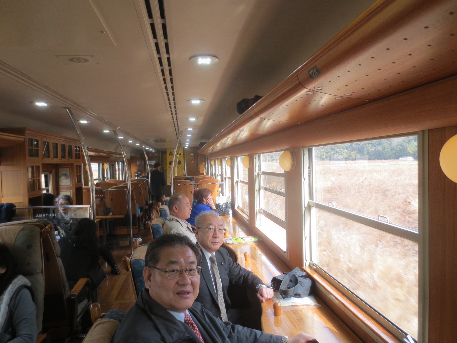 その後、喜入駅より、オレンジ列車、たまて箱列車など調査視察をさせて頂きました。素晴らしい列車です。飯田線にも走らせたい列車です。ね。 たまて箱列車の座席です。外人に人気が集まっていました。黄色の電車がオレンジ列車です。 長い調査研究活動でしたが収穫が沢山有りました、これから長野県に出来る事事から始めます。実行あるのみですね。まずは、リニア中央新幹線から飯田線の活性化ですね。