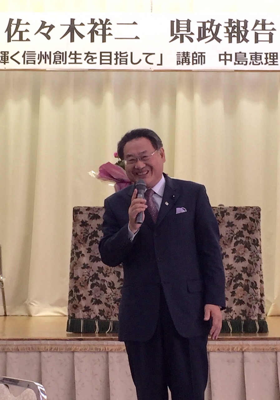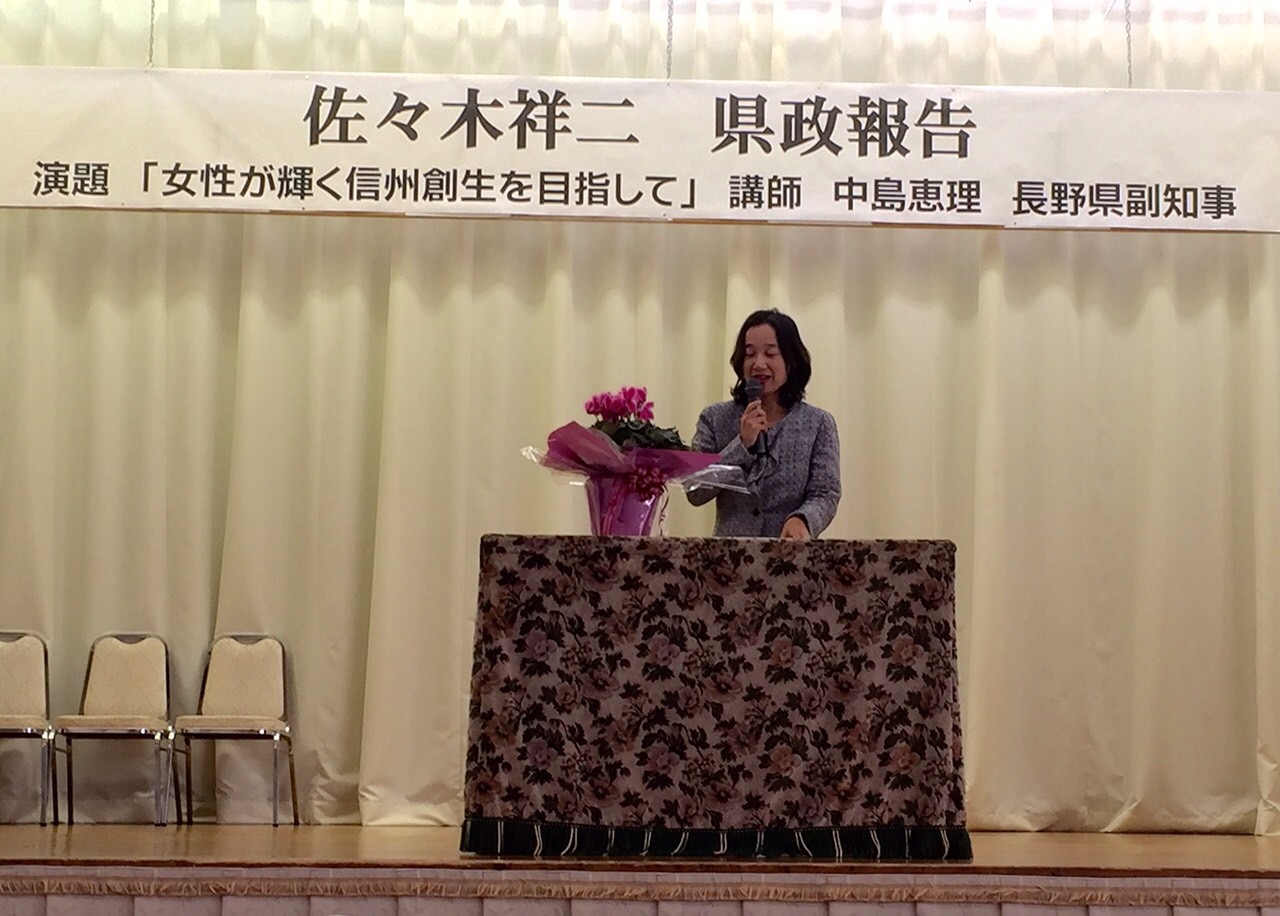 講師に長野県副知事中島恵理さんをお招きをし、女性が輝く地方創生を目指してと、題して講演をして戴きました。 その後私が県政報告をさせて戴きました。 認知症対策、ここ駒の大学院構想、長野県リハビリセンターサテライト駒ヶ根、認知症認定看護師の充実など話をさせて戴きました。