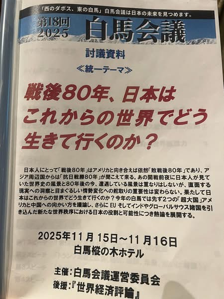 17日今日も天を敬し報恩感謝にて元気に張り切って働きます。 先日の2025白馬会議の第三セッション武者先生の 米中狭間で問われる日本独自の世界構想力と題して講演が有りました。これからの米中日本の進むべき道を示してると感じました。素晴らしい情報力と構想力でした。 また上田きよし参議院議員先生も参加され,素晴らしい資料提供され説明も戴きました。