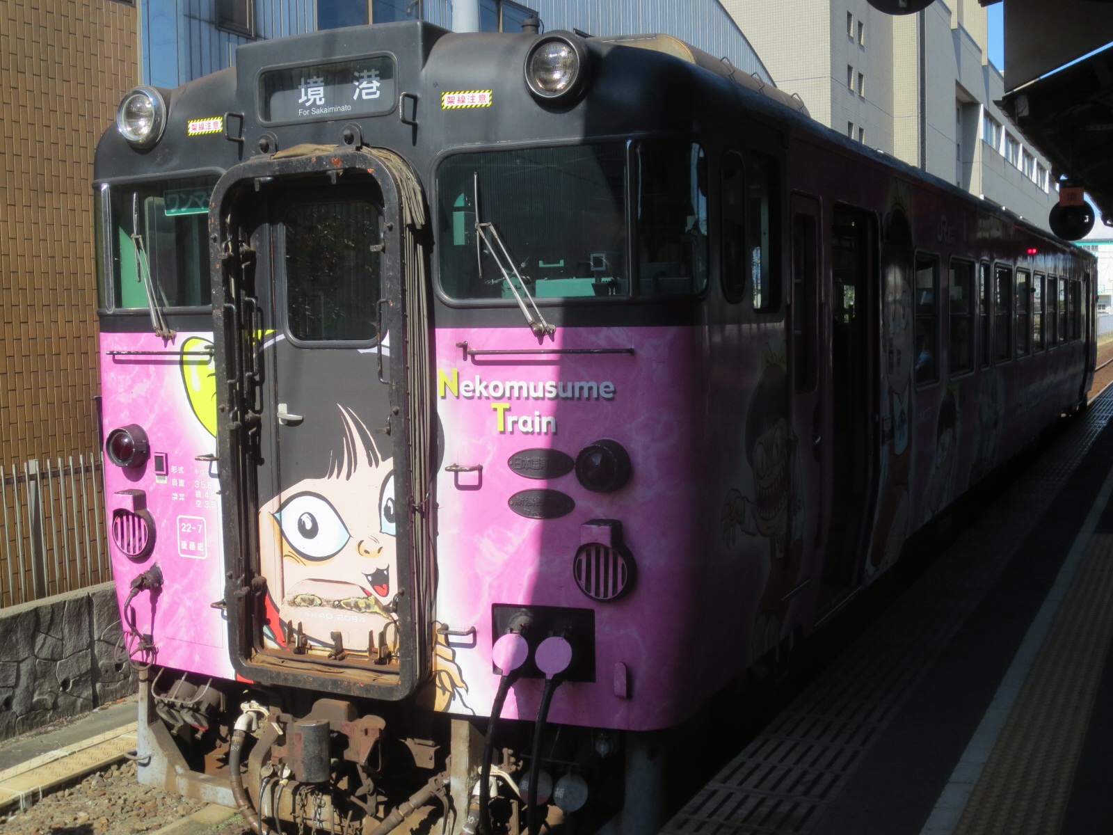 池田課長さんに案内して頂きリハビリテーション.福祉ホーム.在宅介護支援センター.デーサービスなど調査させて頂きました。 全て直営で運営されていて、栄養部セレクトメニュー、特別管理食事療養など行き届いていました。大変参考になりました。感謝です。 米子から境港市に向かいました。そこでは、ゲゲゲの鬼太郎バージョンの電車でした。 午後三時からは、境港市役所で観光振興策をおお伺い致しました。観光客ゼロから300万人までにした秘策をお聴きしました。大変参考になりました。感謝します。