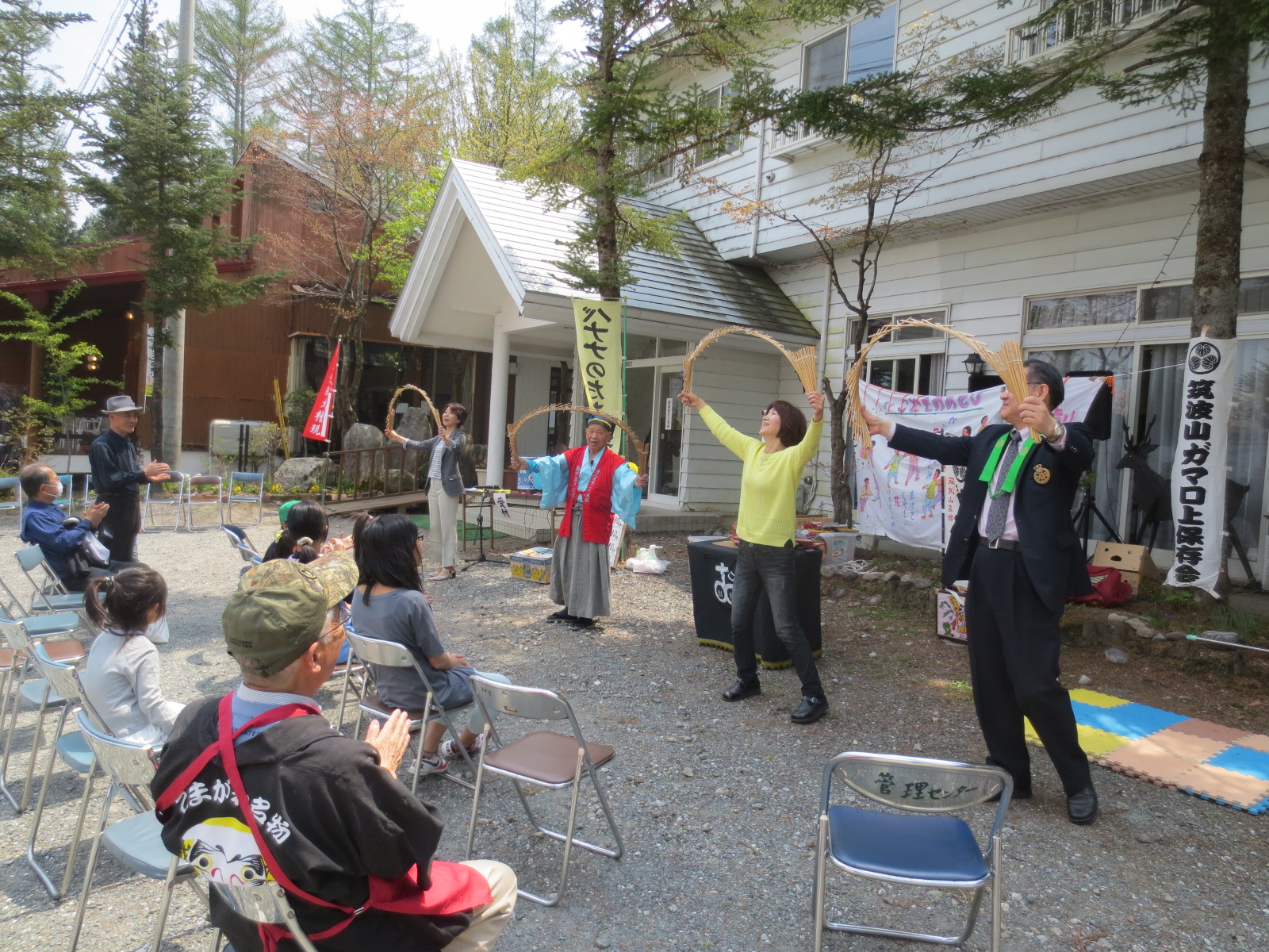 駒ヶ根高原高尾ごりやく市テントバザールの一貫でパポーマンス大会があり大道芸、踊り、ダンス、大正琴など多数出演されました。その中で昨年勉強をした大道芸の先生、宮嶋節男さんが出演してくださり、生徒の私たちも出て南京玉すだれをさせて戴きました。