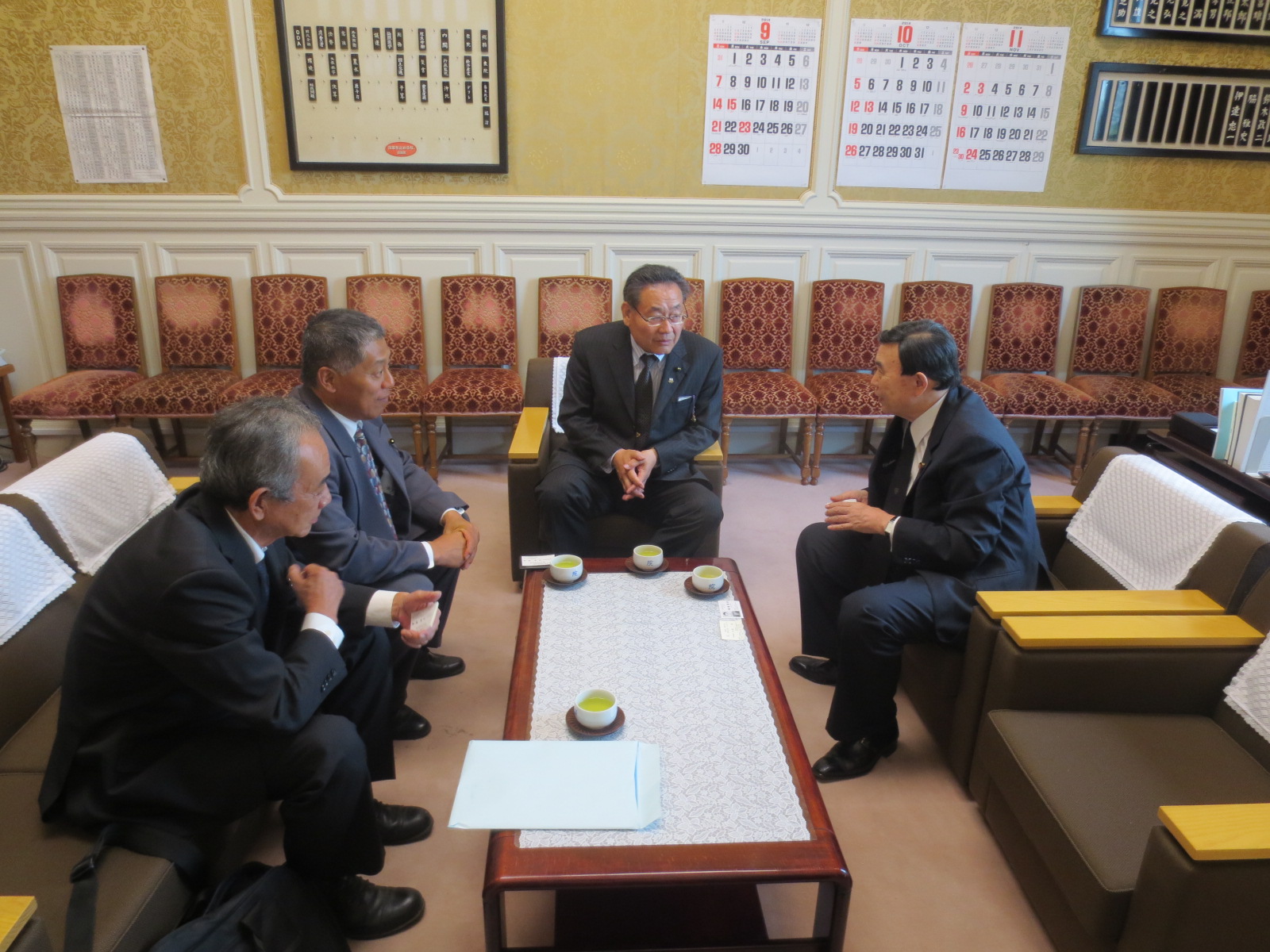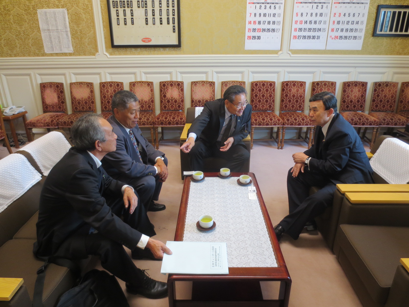 元巨人軍 荒川博コーチ、堀場県議、伊藤事務局長と私とで、長野県ティボール協会の会長さんをお願いにあがりました。 宮下副大臣は快く引き受けて戴き、長野県の青少年育成、障害者スポーツの進展、生涯スポーツ親子三代のレクレ^−ションには最適と抱負を方って戴きました。 荒川先生は、野球の持論とティーボールの普及の利点を語って下さいました。 午後2時30分からは、参議院自民党 吉田博美国会対策委員長室にお伺いいたしました。 吉田先生は、県議会当時から野球部に在籍し、一番センターで活躍された先生で、最高顧問を受けて戴きました。 いよいよ、長野県ティーボール協会は10月26日設立総会を経て発足いたします。 宮下会長、若林副会長、吉田最高顧問。堀場理事長、佐々木専務理事、伊藤事務局長体制で船出いたします。野球底辺の拡大、障害者スポーツの進展、生涯スポーツ(親子三代)の交流、国際親善、レクレーション普及など張り切って進めますので、皆さんご協力宜しくお願い致します。