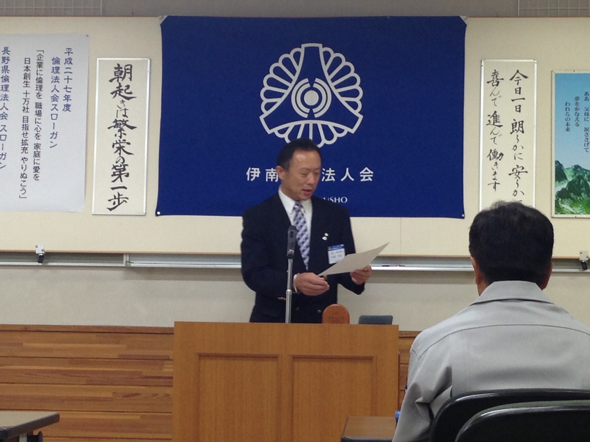 松岡会長の挨拶があり、先月Bクラスにてモーニングセミナーコンテスト出席者一番をとりました,これからも誘い合って参加して下さいと会長講話で始まりました, 今日の講話者は、岡谷市の倫理法人会会長の、小松市男氏でした。素晴らしい話でしたよ、 朝から三億の得をしました。