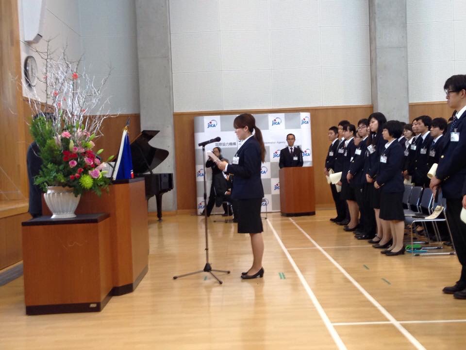 180名近い方々が訓練され任国に旅立ちます。健康には充分注意をされ2年後には無事に帰国されますよう祝辞がありました。 また、代表の方がお礼の言葉を述べ、訓練の厳しかったこと、仲間意識が芽生えみんなで乗り越えた事など話され、これからの責任の重さと不安と夢と希望が重なり合いながら、任国で元気一杯働いてきますと体育系らしい元気なお礼の言葉でした。 後の壮行会で激励をさせて戴きました。