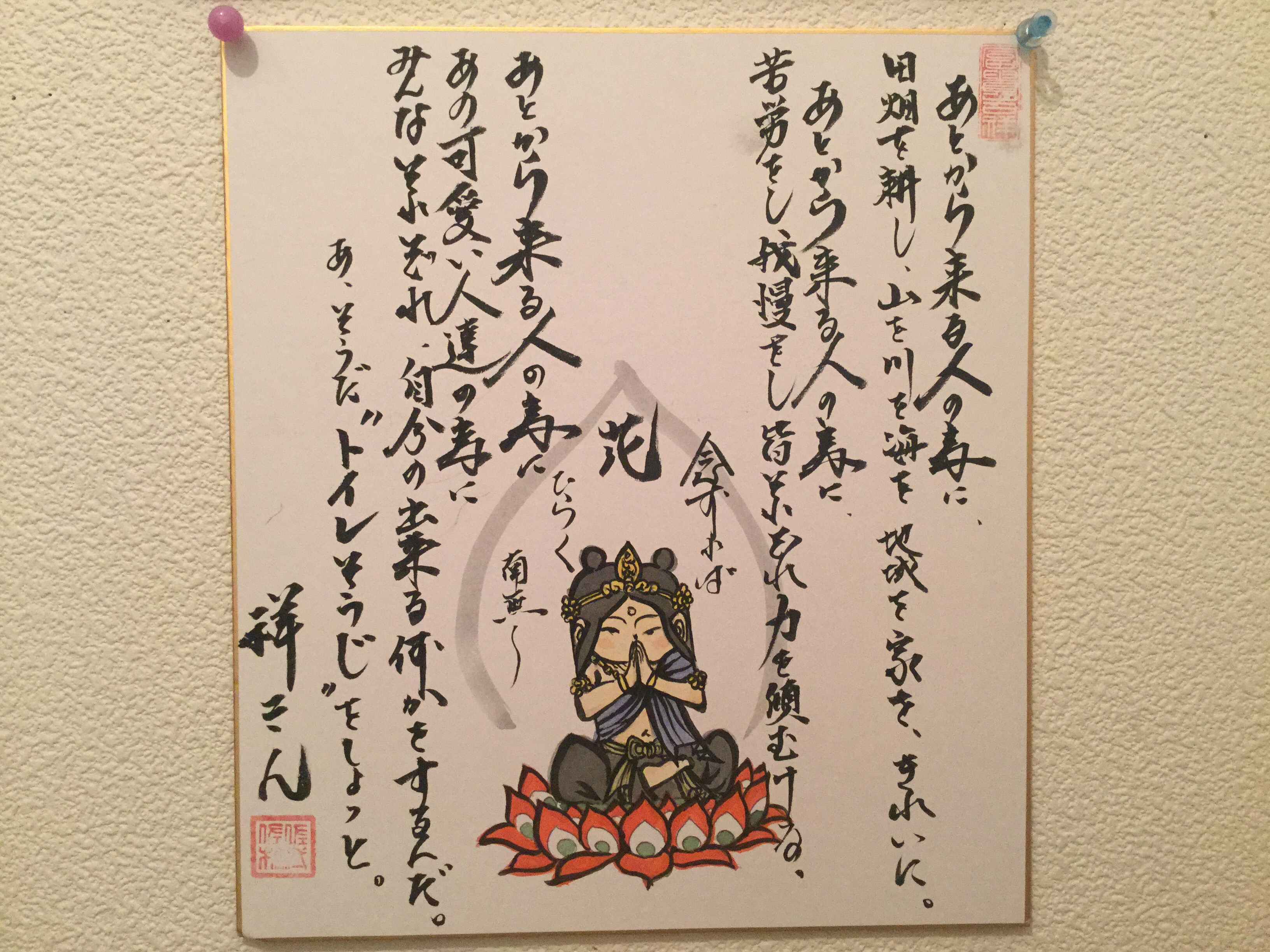 そんな色紙をトイレに飾って有ります。 そんな事で、私はトイレ掃除をさせて戴きます。気持ち良いですよ。 出来ることは楽しくさせて戴きます。あ、、そうそう、金運も上がるみたいです。 次の機会に載せますね。