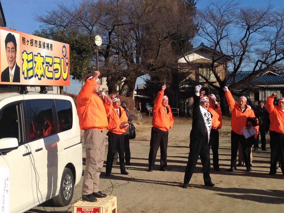 八時に出陣式会場に行きまして、参議院議員の若林健太さんとお先に必勝祈願をさせて戴きました。 私も激励をさせて戴きました。杉本候補も熱の入った決意表明を致しました。 天を突く頑張ろうコールをして出発していきました。