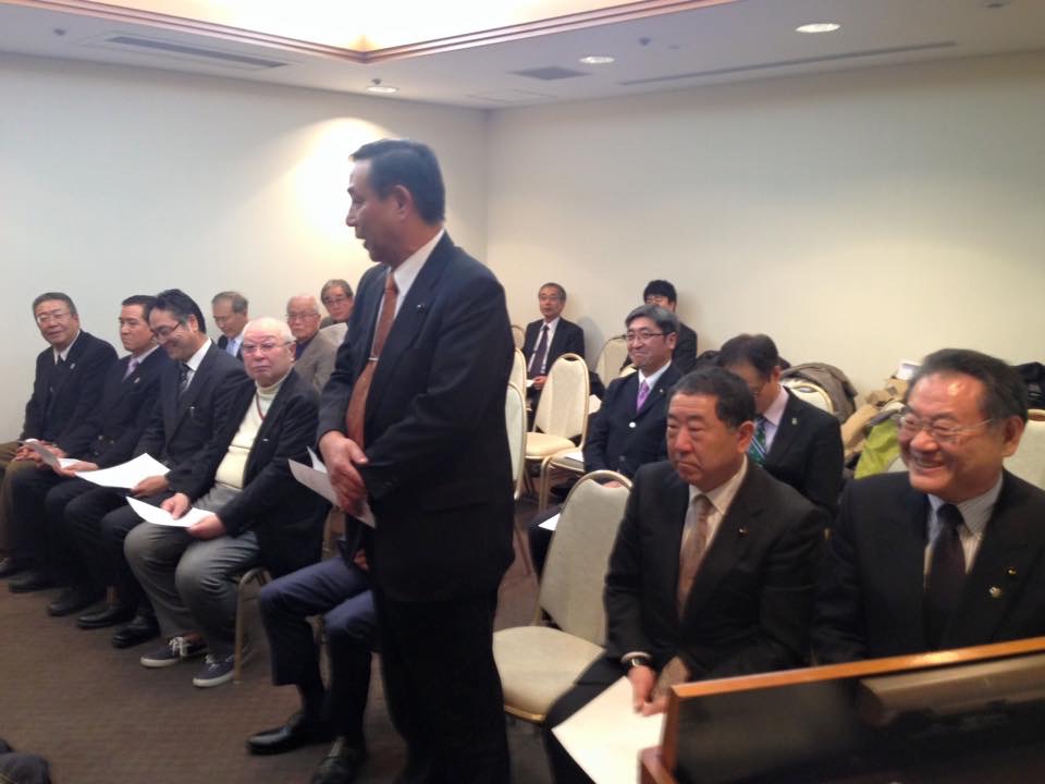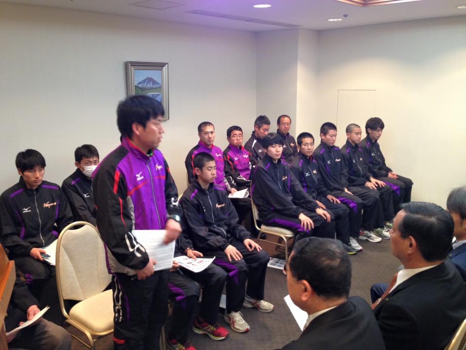 体協副会長、スポーツ議連の会長の萩原 清県議会議員が挨拶をして激励致しました。 高見澤監督は、大会記録更新を目指して頑張ると強く挨拶致しました。 私からも、楽しんで頑張って下さいと激励致しました。
