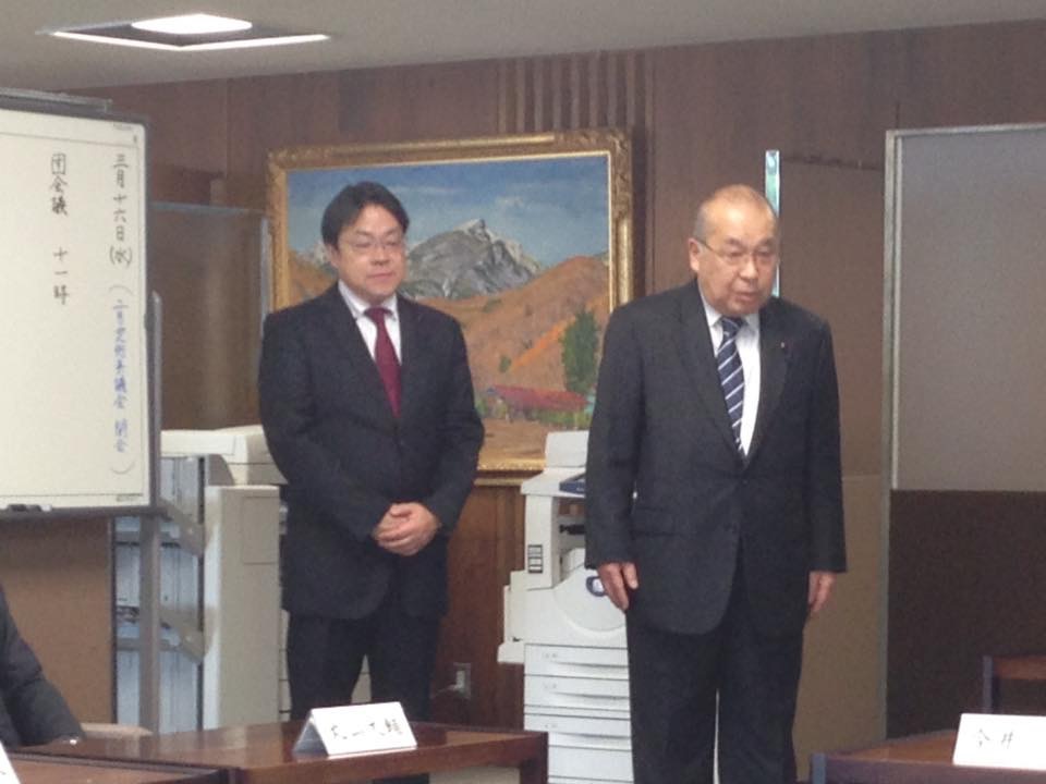 議長に向山議員が立候補しました。副議長には下澤議員が立候補致しました。 午後から選挙が行われ、議長推薦で向山議長が誕生致しました。 向山議長が席に着き、副議長選挙が行われて、議長推薦により、下澤議員が副議長に就任致しました。 二人で挨拶まわりをしていました。