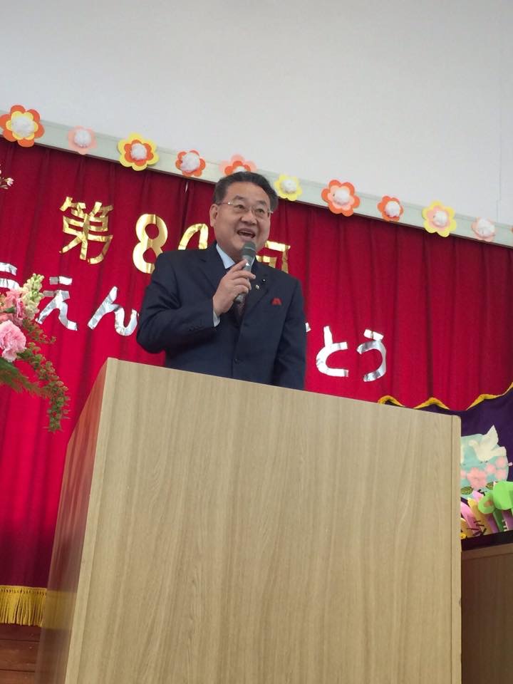 小原理事長の挨拶で始まりました。 私も娘二人と孫もお世話様になっています。 来賓祝辞でお祝いを申し上げました。 式典が終了後、歓迎の劇手遊びなどで雰囲気を醸し出していました。