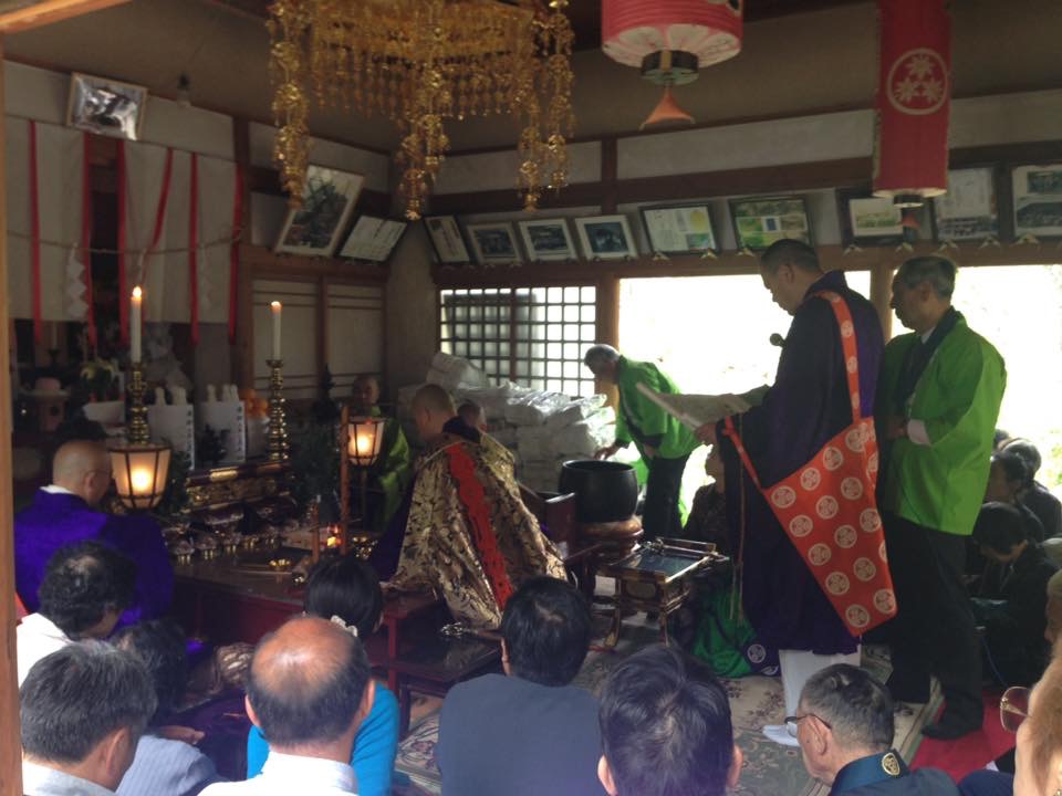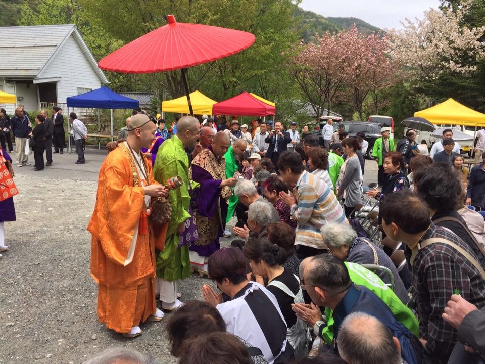 山伏先導にて本堂に向かいました。 熊本震災の終息を願い、被災者の方々のお見舞いそして日本国の弥栄と長野県の平安、信徒檀徒の安全安心と安寧を願いお護摩が焚かレました。 その後、お数珠頂戴があり全員にお数珠頂戴されました。