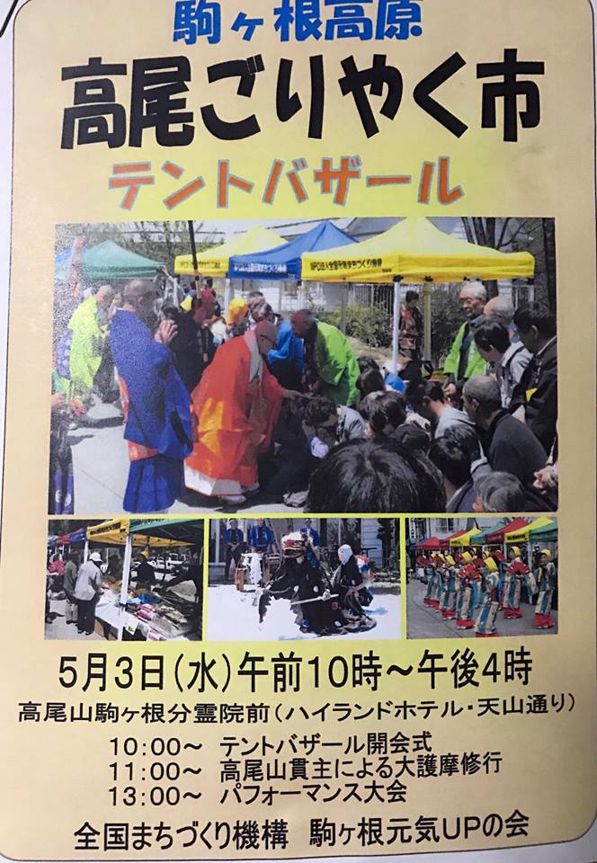 ![]() 高尾山駒ヶ根分霊院(ハイランドホテル前)にて、ごりやく市を開催いたします。 また、高尾山による大護摩修行などしていただきます。 ぜひお越しくださいね。