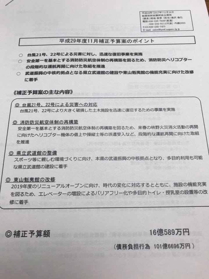 ![]() 台風災害への対応、消防防災航空体制の再構築、県立武道館整備、東山魁夷館の改修など補正予算16億余円債務負担行為101億余円です。 ![]() ![]() また、政務調査費に関わる住民訴訟につきましては全面勝訴でした。 ![]()