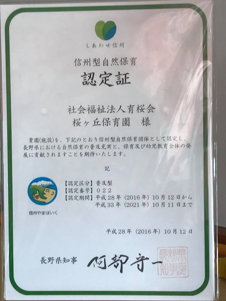 出席させていただき祝辞も述べさせて戴きました。 ![]() この保育園も信州型自然保育の認定証を頂いています。有効に活用してください。 ![]() 私の孫もこの保育園に入園させていただきました。頑張って下さいね。