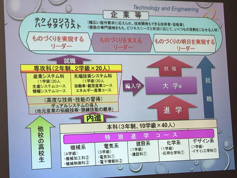 ![]() 本当に素晴らしい教育をしています。三年の教育の後、専攻科二年有り名城大学の先生、各企業の研究者が講義と実習をしています。 ![]() 医療と工業連携、リニア工学、高大連携、学生がデザインから手掛け折りたためる電気自動車は、東京モーターショーにも出展しています。 ![]() 校舎も素晴らしいく、総てが教育になっていました。長野県の工業高校の参考になります。