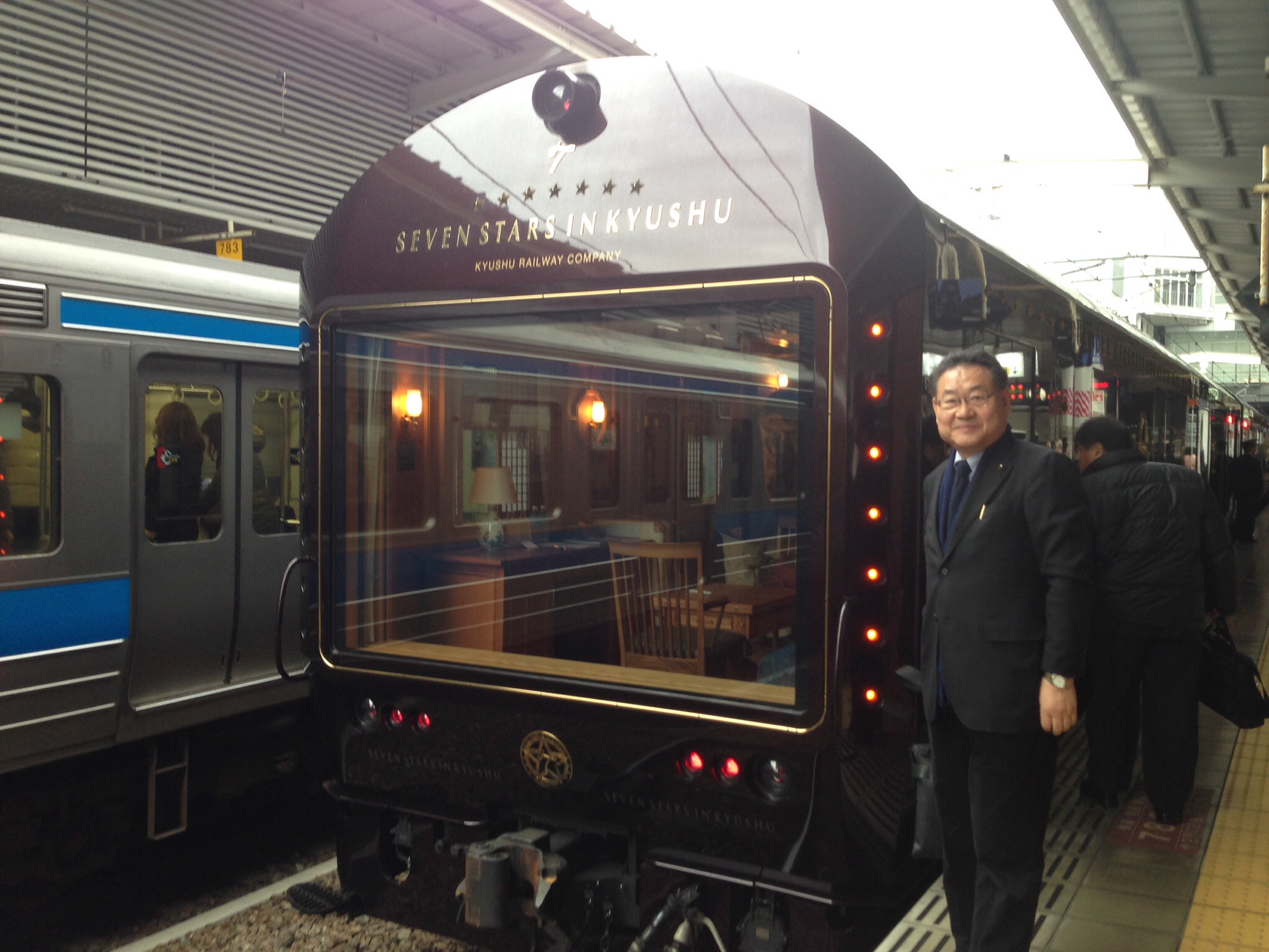 本日羽田空港を旅立ち、福岡空港そして駅へ、ここ人気の「ななつ星in九州」の調査研究をさせて戴きました。七両編成で14組28名b限定、抽選会で当選した方のみで、何と一人70万円デスと。しかも70倍の競争ですよ。