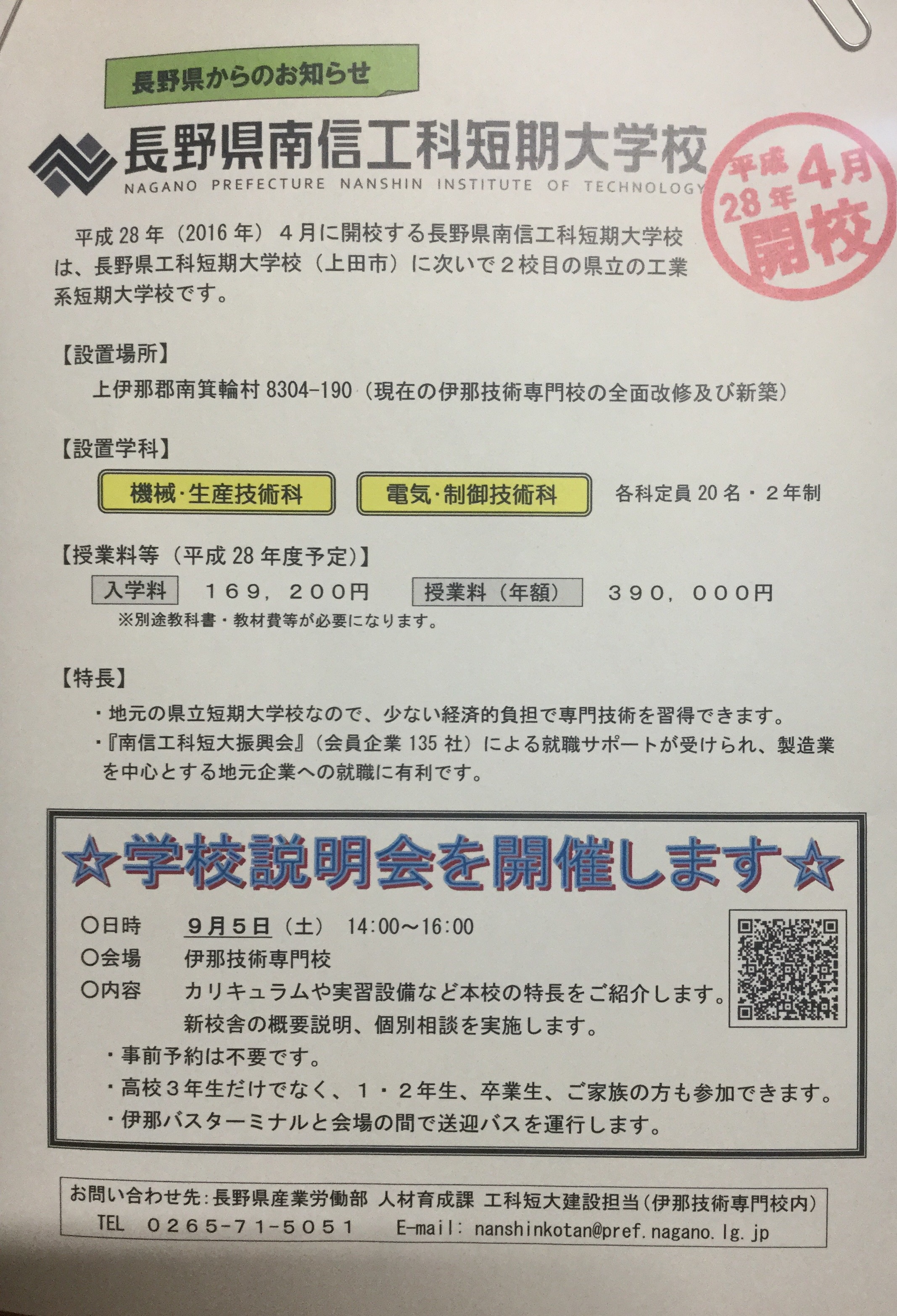 いよいよ、来年平成28年4月開校の長野県南信工科短期大学校の学校説明会が開催されています。