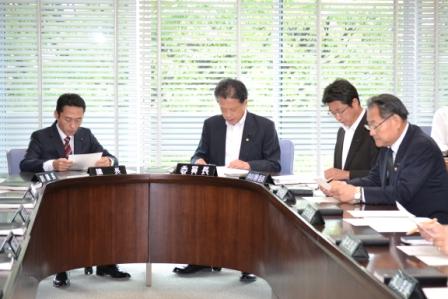 風間議長より、今回の災害をかんがみ、知事からの要請もあり、本日と1日の2日間延期し、各派代表質問は、10月2日3日としたい旨お話がありました、協議に結果そのように決定致しました。 議長より、議事日程通知書が各議員に配布され、開議の日時は平成26年10月2日午前10時再開となりました。