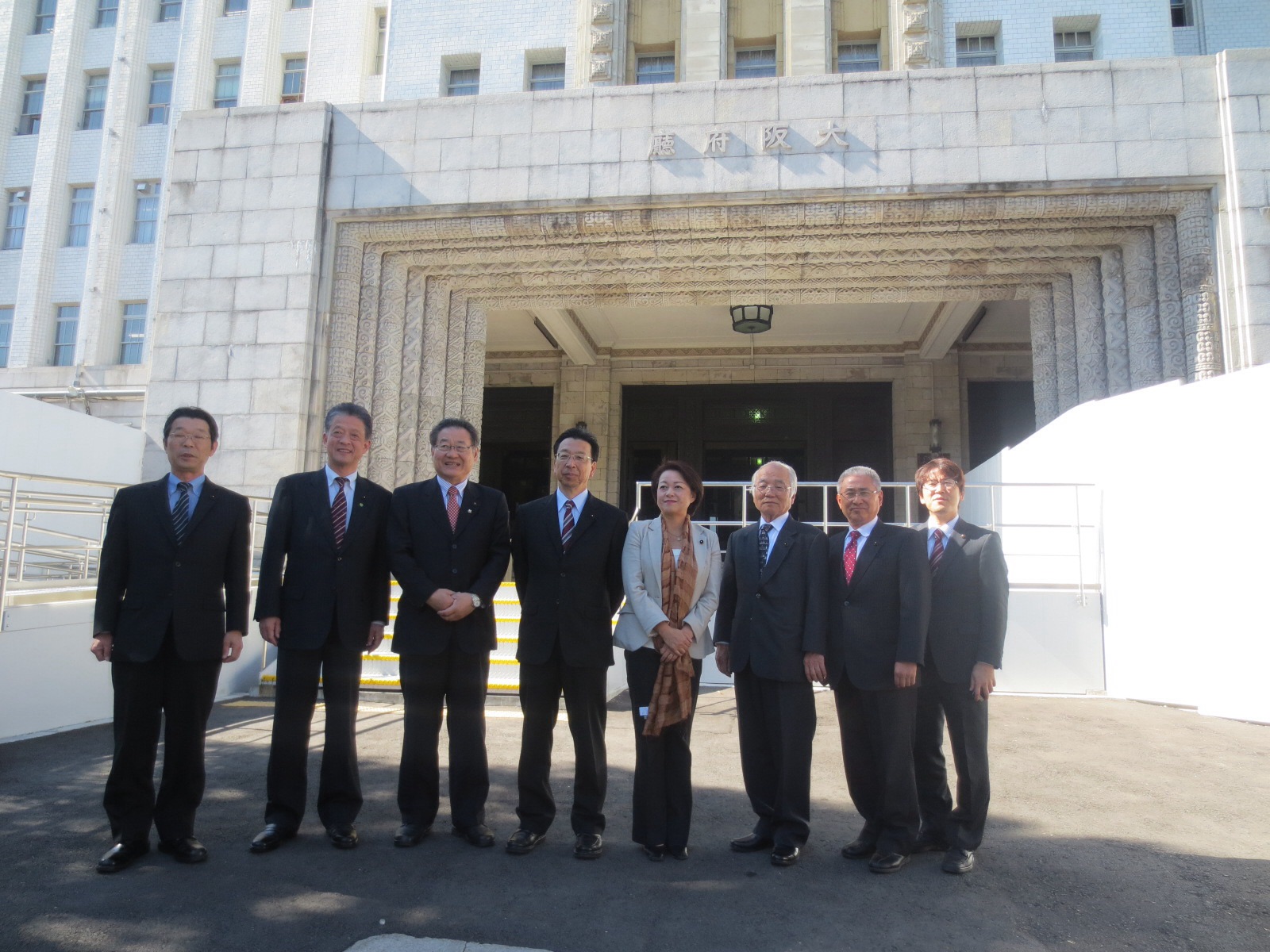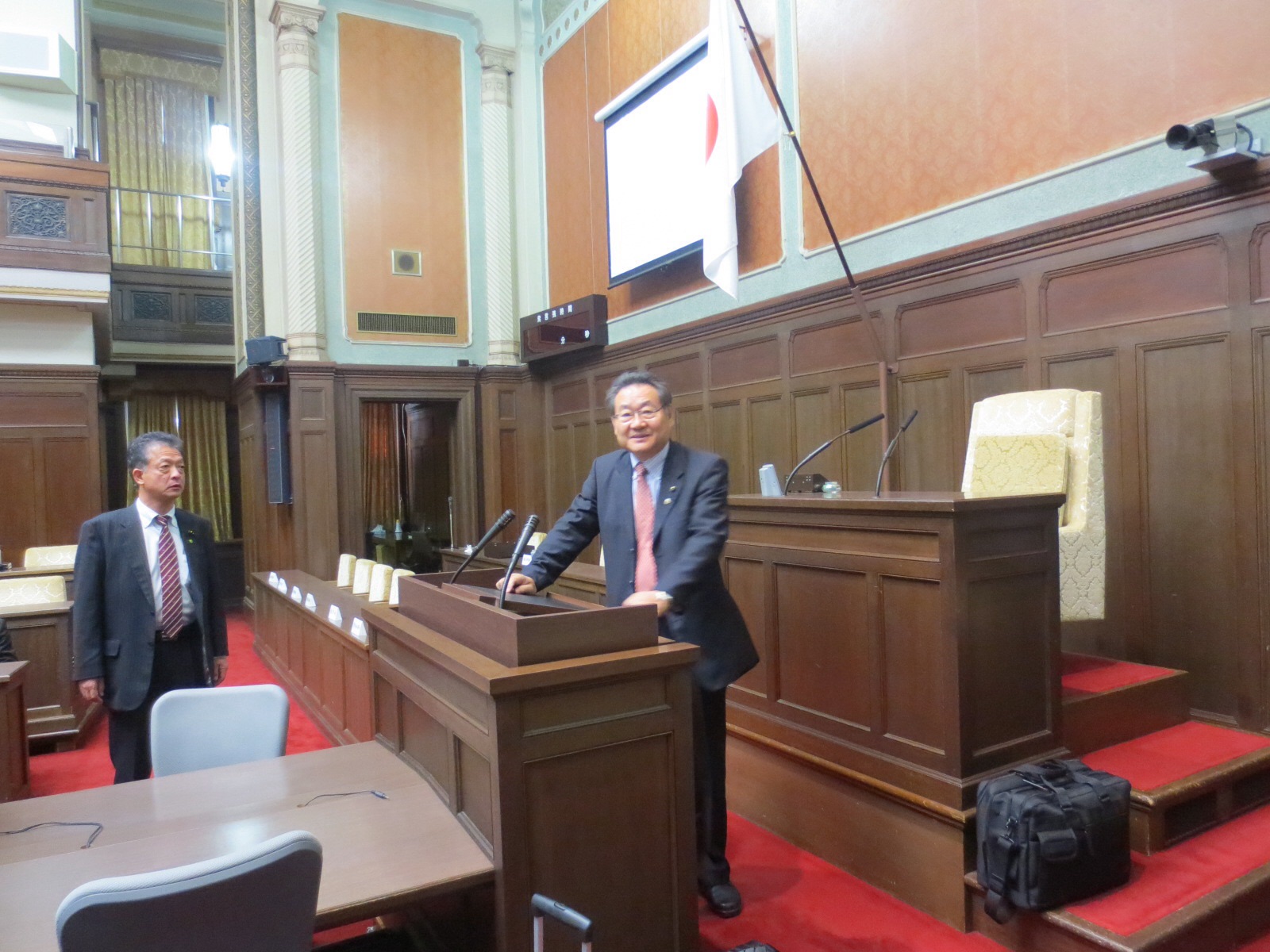 大阪府庁を調査視察させて頂きました。委員会室でお話を聴きましたが、長野県も子の様な委員会形式が良い様に感じました。 条例制定の背景、こども条例、性被害から守条例、ガン対策条例など議会提案している条例など勉強をさせて頂きました。 議場も見せて戴き、議会運営委員・理事会・政務調査委員会なども視察させて頂きました。 大変参考になり明日の長野県の為に参考にさせて頂きます。 最後全員で写真を撮り大阪府庁を後に致しました。今回の視察も大変有意義で参考になりました。明日のしあわせ信州に役立つ様進めて参ります。
