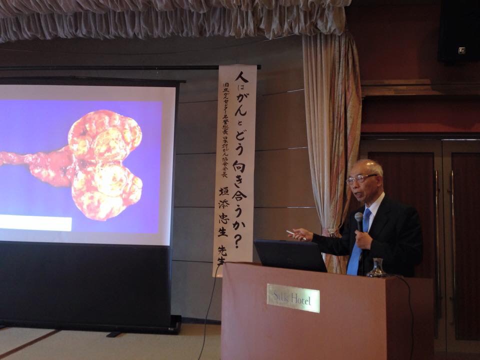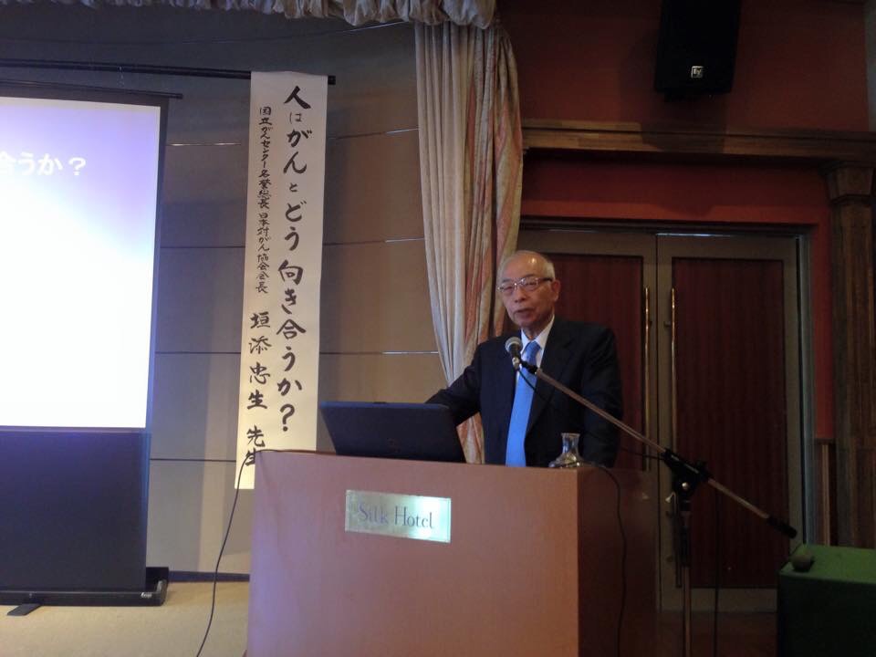 垣添先生は、国立がん研究センターの名誉会長と日本対ガン協会会長さんです。 自らの体験談と奥様の闘病生活を話され、感動致しました。 そして人は10の27乗から10の➖ 35乗まであり、儚いものだが、一担信念と決心で奇跡を起こせる。とお話がありました。素晴らしく感動する話でした。