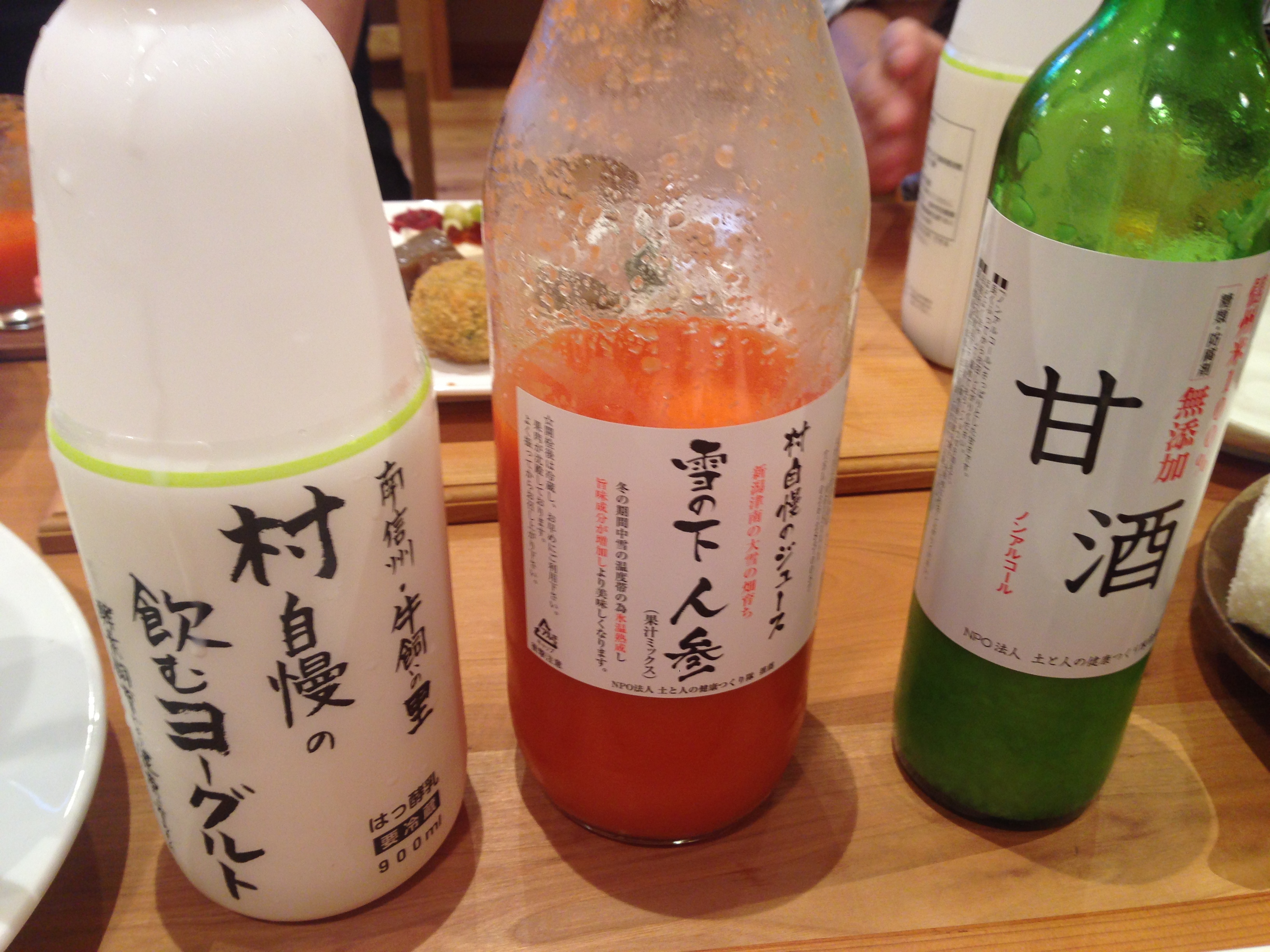 夕食に自家製の無農薬野菜など出まして、とても美味しく戴きました。 朝食も美味しく戴きました。 甘酒、雪の下人参ジュース、これは飯山津南町の有機野菜ですよ。又、南信州村自慢飲むヨーグルトなど評判でした。