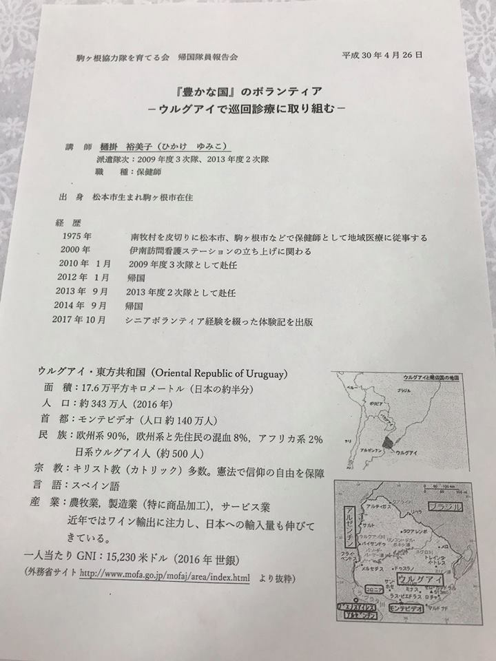 ![]() その後、シニアボランティアの通掛裕美子(ひかげゆみこ)さんのウルグアイでの帰国報告会もありました。 ![]() 「豊かな国のボランティア」の本も自主出版され、2009・2013年と二度行かれています。凄い方です。 ![]()